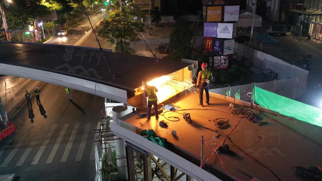 “天橋建造采用工廠預(yù)制、現(xiàn)場(chǎng)吊裝的施工模式。構(gòu)件按圖紙?jiān)趯I(yè)的鋼結(jié)構(gòu)加工廠進(jìn)行預(yù)制,經(jīng)過嚴(yán)格焊縫檢測(cè)合格后,按施工順序運(yùn)輸?shù)浆F(xiàn)場(chǎng)進(jìn)行吊裝,每次安裝2節(jié)?!爆F(xiàn)場(chǎng)負(fù)責(zé)人徐宇介紹道。