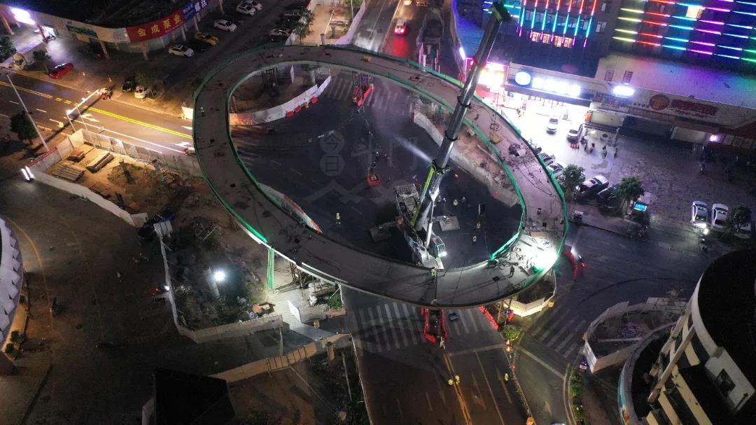 凌晨2點(diǎn)10分,經(jīng)過1個(gè)多小時(shí)的緊張施工,隨著最后一節(jié)約8米的弧形鋼箱梁落在預(yù)設(shè)位置,與兩頭梁體連接得嚴(yán)絲合縫,12節(jié)鋼箱梁連接成一個(gè)橢圓形,“甜甜圈”成型了!